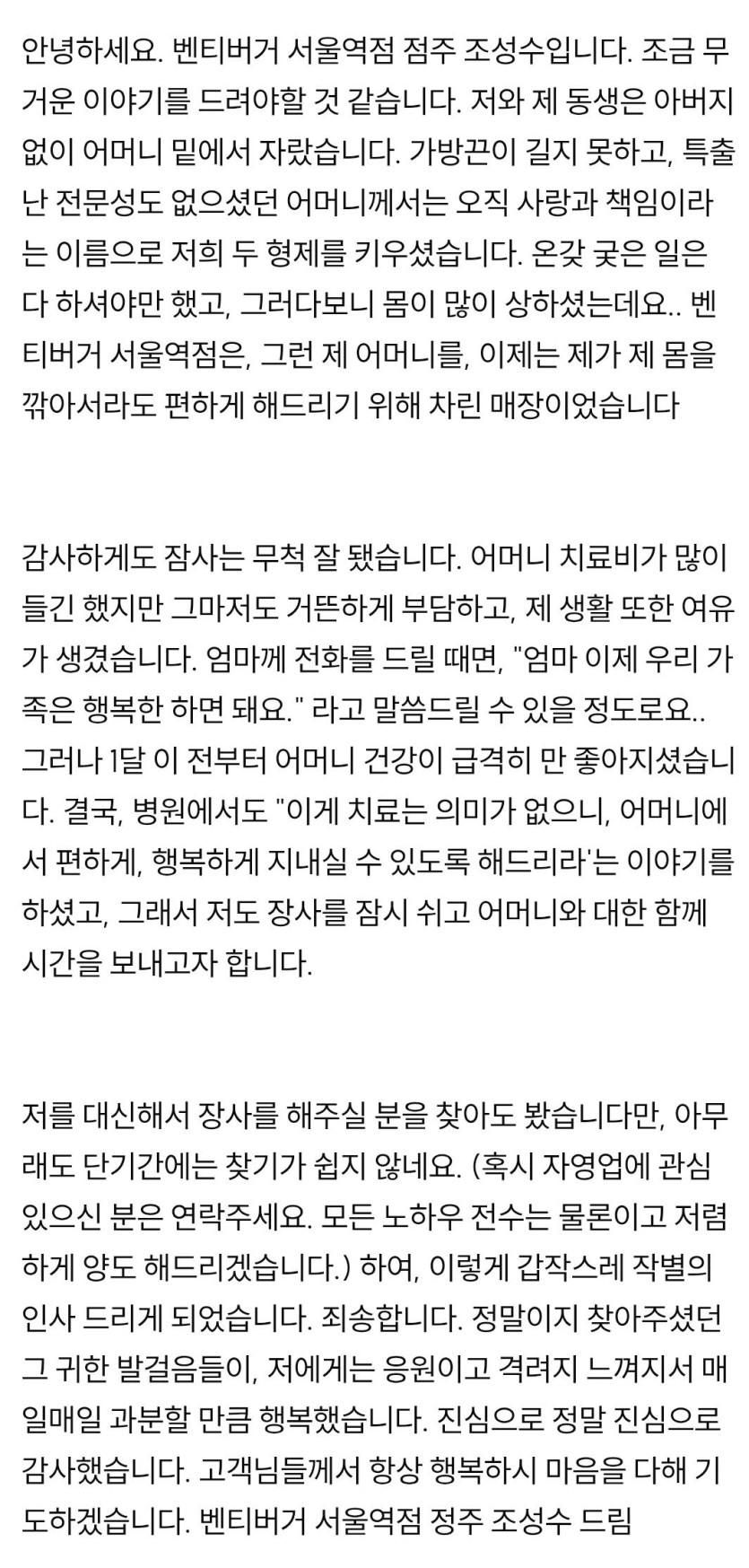 어느 햄버거 가게의 휴업 공지 이유