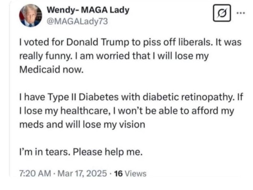 "나는 리버럴들을 화나게 하려고 도널드 트럼프에게 투표했어요. 그게 정말 재밌었어요. 그런데 이제 내 메디케이드(미국 의료보장 프로그램)를 잃을까 봐 걱정돼요.