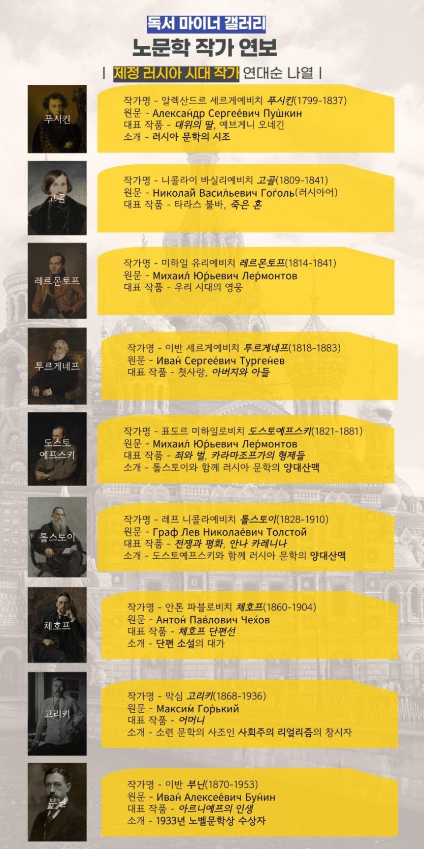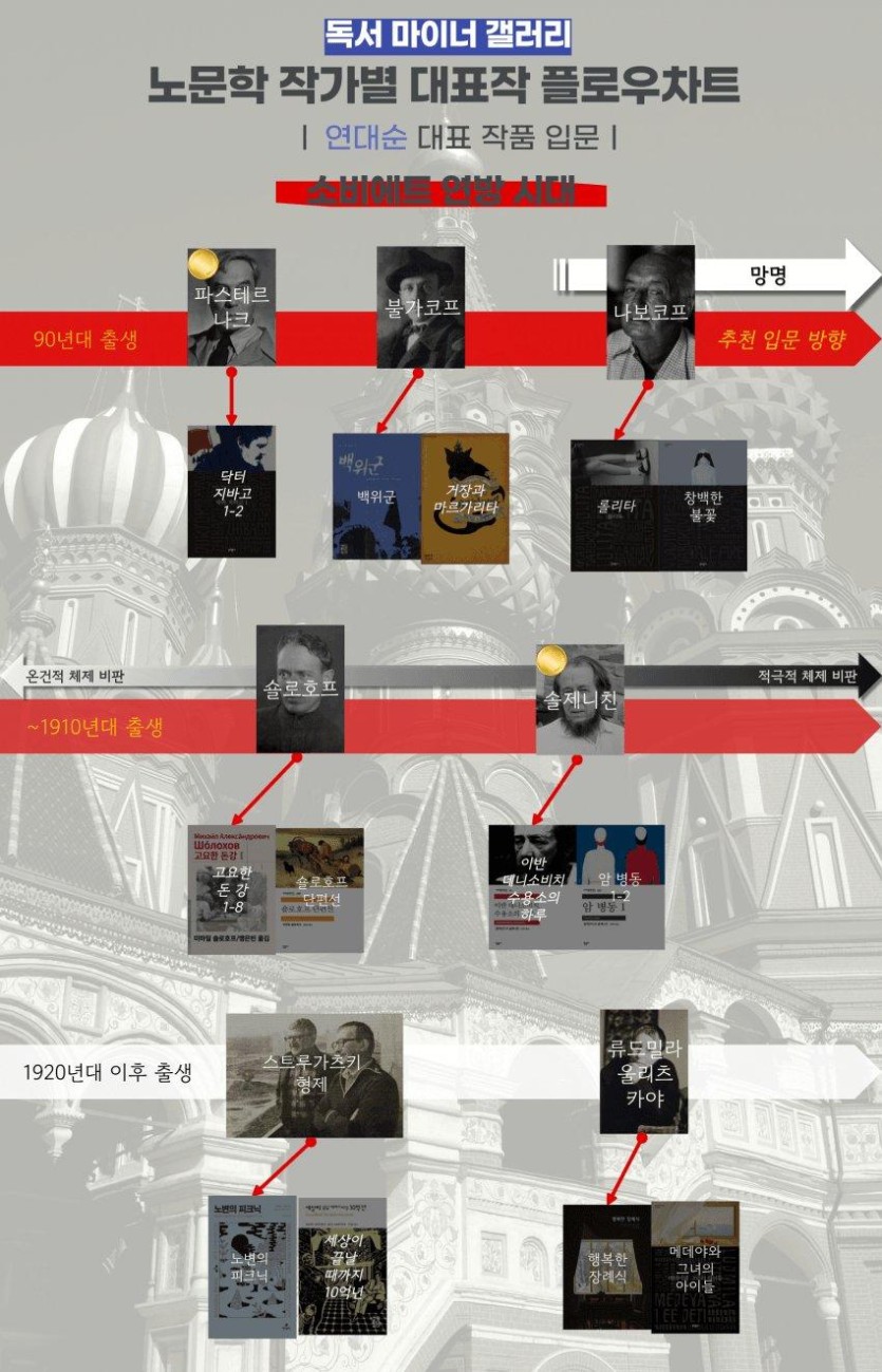 조별과제 자료조사를 디시에서 해옴.jpg rh1 0 226 0 2025.03.20 17:45 문제는 내용이 알참https://gall.dcinside.com/mgallery/board/view/?id=reading&no=701934- 시간 순서대로 제정 러시아-소련 작가 소개 본토 러시아 작가들 중심으로 소개했음장편-단편 소설가 중심이라서 에세이로 유명하고 벨라루스 국적인 스베틀라나 알렉시예비치는 제외했음나보코프는 망명 작가라서 하얀색으로 표시, 류드밀라 울리츠카야는 소련 붕괴 이후에 소개된 현대 작가라서 하얀색으로 표시- 노문학 플로우차트 초안 대표작은 이텔릭체로 기울여져 있는 거임.여기서 추가하거나 수정해야 할 거 같은 부분 있으면 댓글로 추가해주길 바람대표작으로 더 적절한 것이 어느 것인지, 플로우차트 수정하는 것이 좋을 거 같으면 댓글 부탁함개인적으로는 나보코프 파트는 나비단의 참조를 받아 수정하고 싶음.- 참조한 플로우차트안톤 체호프 - 0