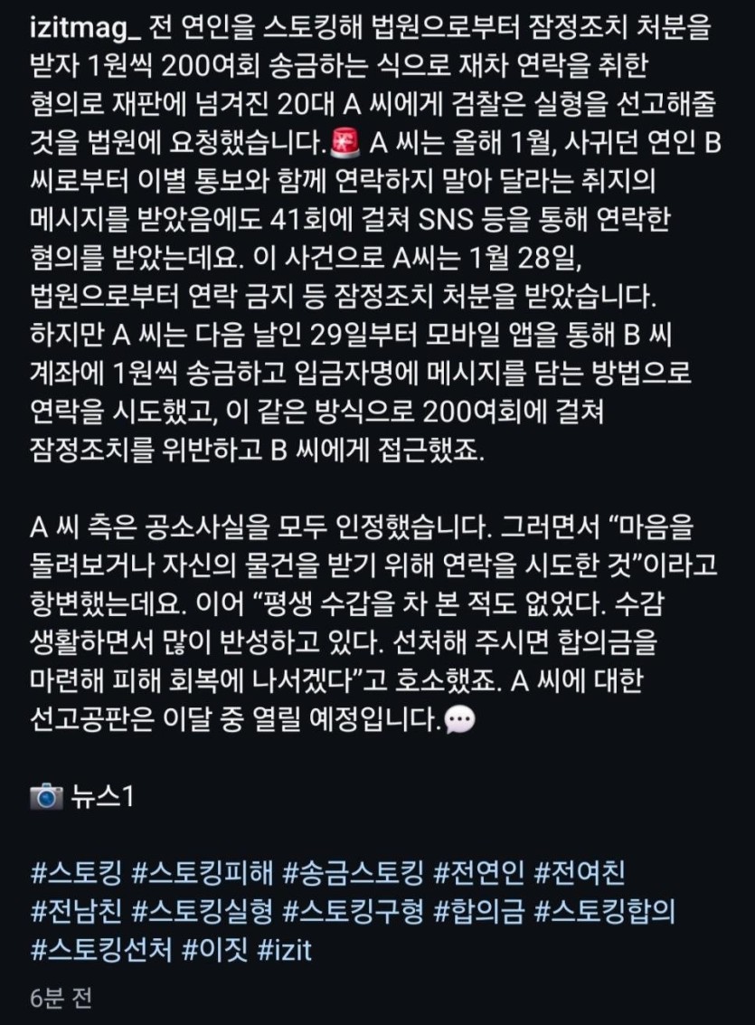 "보고싶다" 1원씩200번 송금한 20대 징역 1년6개월 구형
