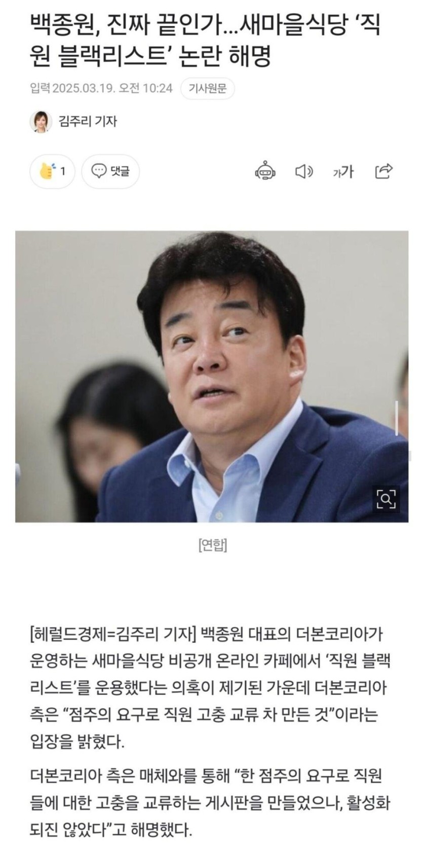 백종원 직원 블랙리스트 논란 해명. rh1 0 86 0 2025.03.19 14:30 [단독] 백종원 '직원 블랙리스트' 정황 논란…계속되는 구설. 점주의 요구 때문에 만들었다고 0