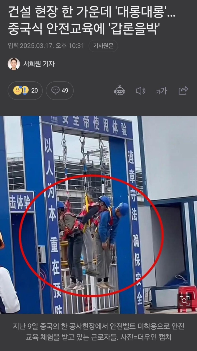 건설현장 안전벨트 교육 논란....jpg rh1 0 177 0 2025.03.18 19:45 건설 현장 한 가운데 '대롱대롱'… 중국식 안전교육에 '갑론을박'안전벨트 안차면 대롱대롱 메달리는거임 0