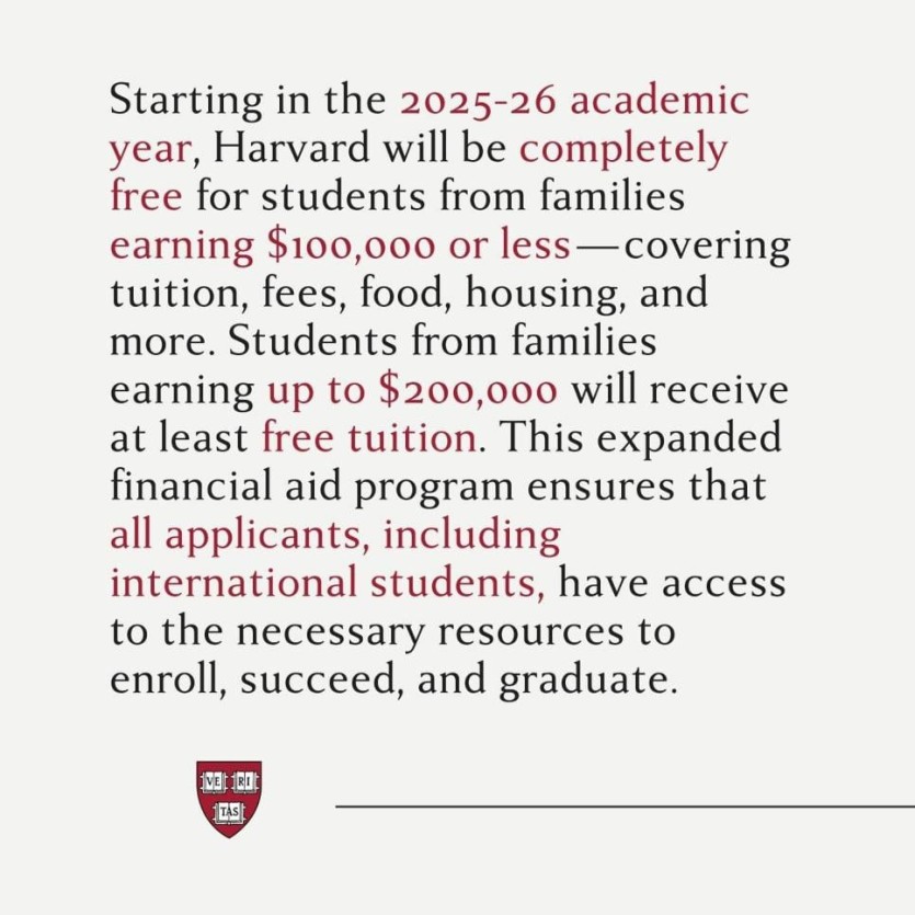 통 큰 하버드대학교의 결정 rh1 0 147 0 2025.03.18 16:00 하버드대학교에 지원하는 학생들 가운데 앞으로 가족의 연소득 10만불 이하인 가정의 학생은 등록금, 식비, 주거비, 기타 비용 전액 무료이고 연소득 20만불 이하인 가정의 학생은 등록금이 면제된다고 발표함. 거기다가 이 헤택은 미국 국적의 학생들 뿐만 아니라 외국 학생들의 경우에도 동일하게 적용된다고. 0
