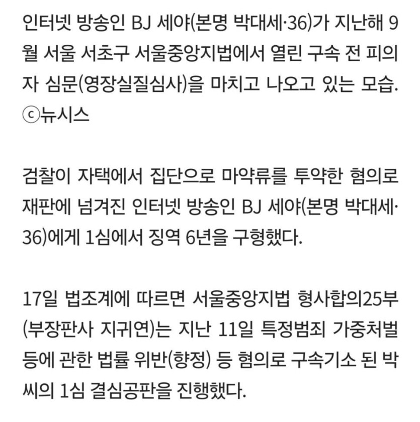 [사회] '집단 마약투약 혐의' BJ 세야, 1심서 징역 6년 구형