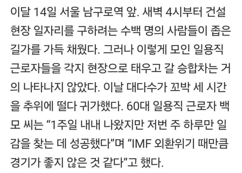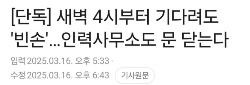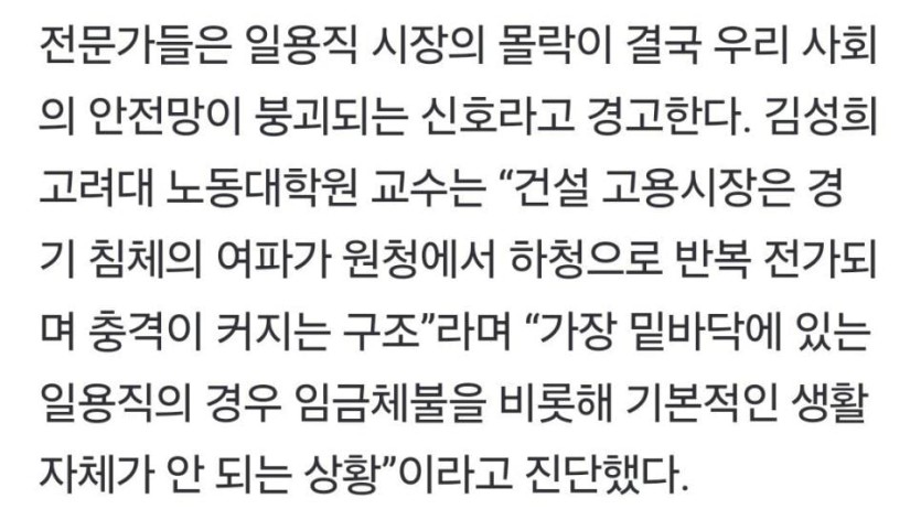 일용직 시장 몰락 진행, 사회 붕괴 시그널 ㄷ.jpg rh1 0 86 0 2025.03.17 09:30 https://n.news.naver.com/article/011/0004461832?sid=102 0