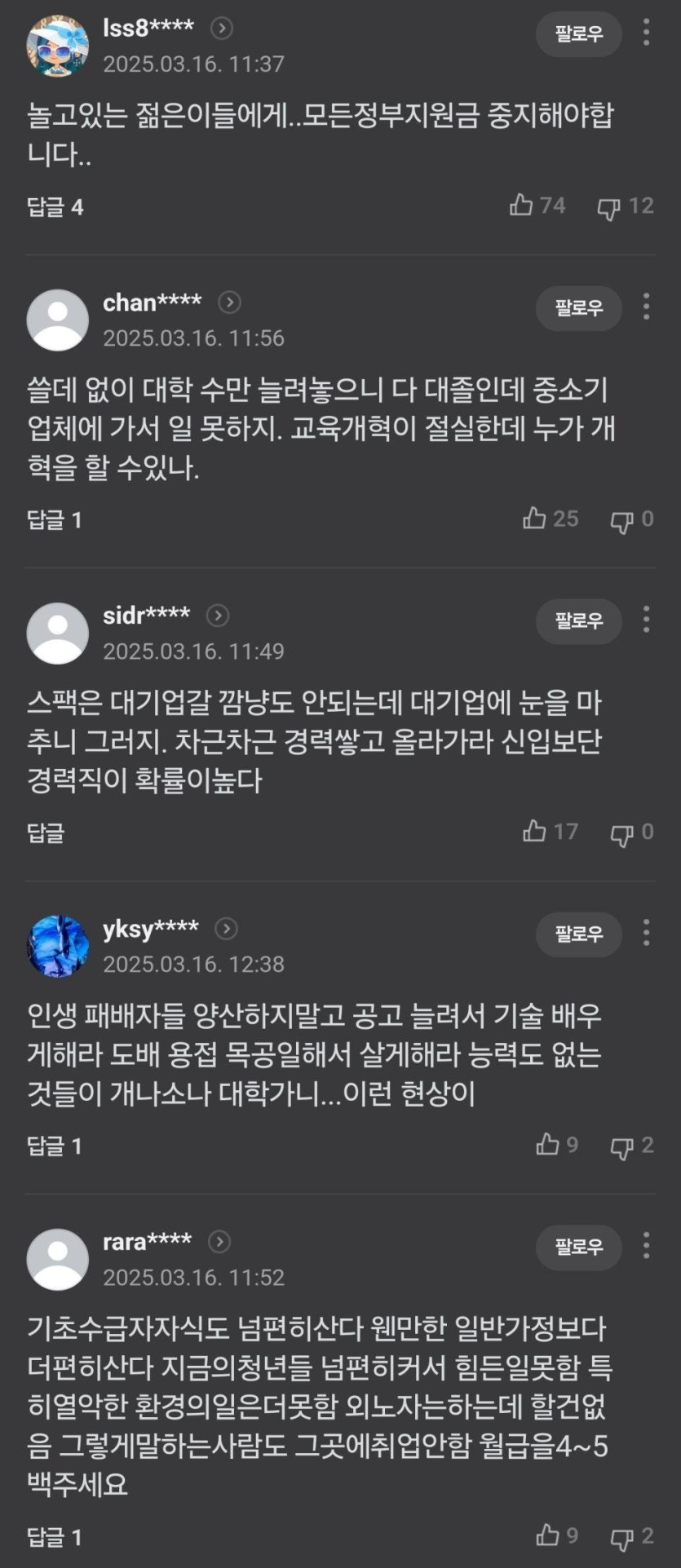 청년백수 120만명... 네이버 반응.jpg rh1 0 182 0 2025.03.16 23:15 청년 지원금 중단해야한다중소기업은 안들어가냐용접 목수일 배워서 해라너무 편히 커서 힘든일 안하려고 한다댓글만 보면 마치 청년 구직자가 눈이 높아서건설업계에 안들어가고 대기업에만 들어가려고 하면서 어디선가 지원금?을 타먹는거같음그런데.... 현실은 일자리 한자리에 4명이 달라붙는중 ㄷㄷ거의 경력자 채용중이라 경력이 부족한 청년은왠만한 중소기업도 가기 힘들음건설업계도 마찬가지임 0
