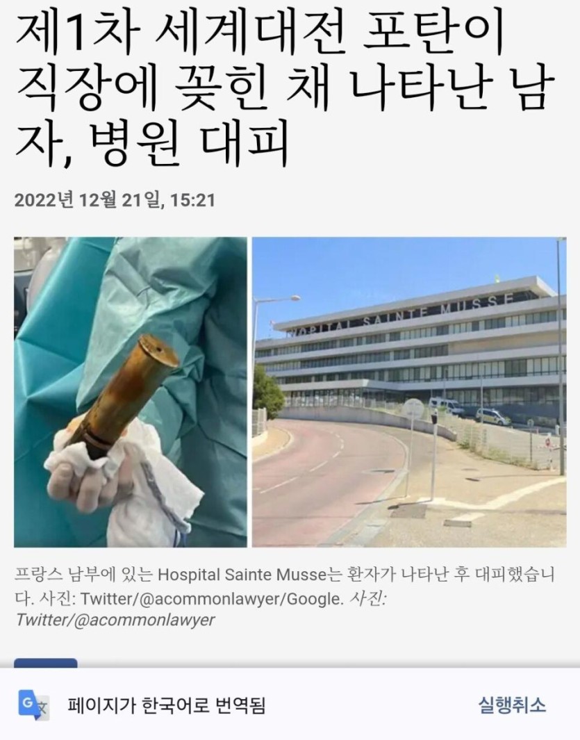 프랑스에서 88세 할아버지가 자신의 남동생 집에서 제1차 세계대전 포탄을 발견한 후, 성적 호기심으로 포탄을 본인의 항문에 삽입함