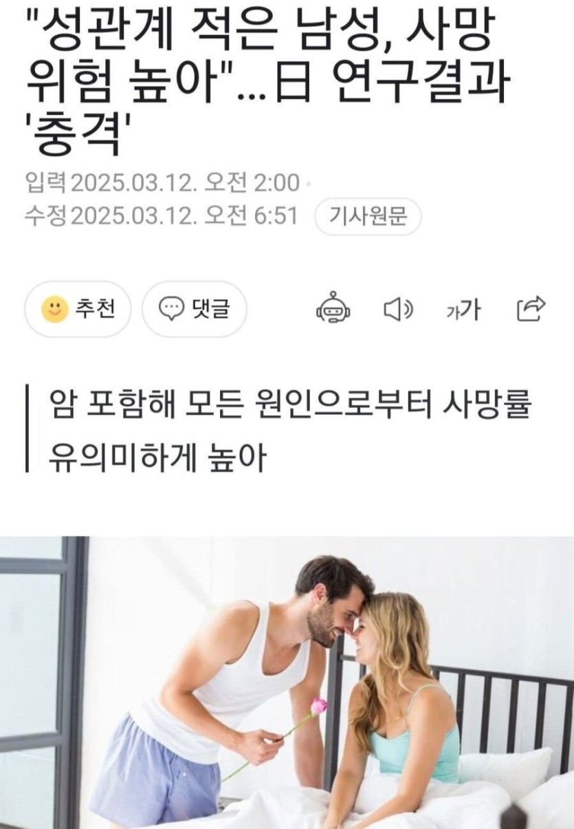 "성관계 적은 남성, 사망 위험 높아"…日 연구결과 '충격'.gisa rh1 0 127 0 2025.03.13 13:15 "성관계 적은 남성, 사망 위험 높아"…日 연구결과 '충격' 이제 사망 위험 까지.....요.... 0