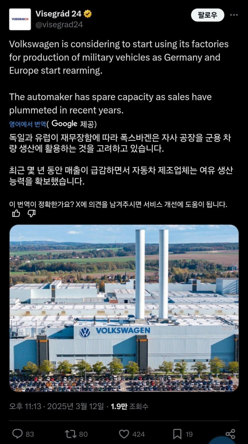 독일 폭스바겐, 군수공장화 발표