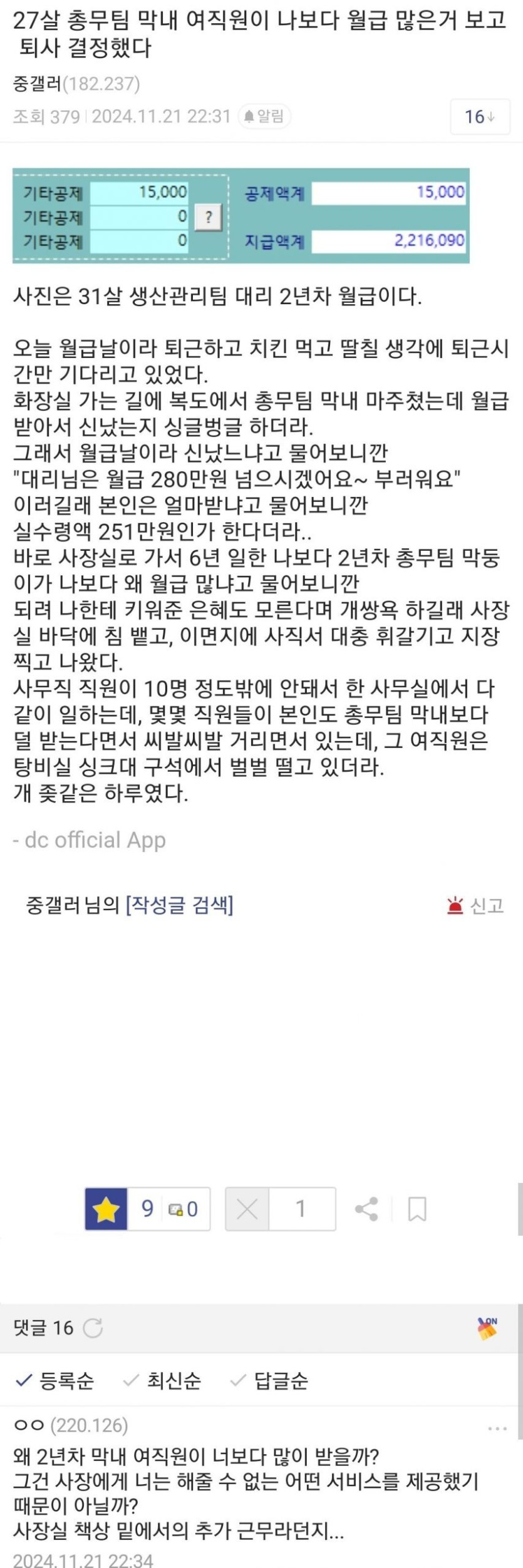 [유머] 27살 막내보다 월급이 적어서 퇴사 결정한 6년차 대리 rh1 0 207 0 2025.03.12 21:15 사람들이 경리 ㅈ으로 아는데 경리가 중요한 포지션인지 모르는 사람 많음 ㅋㅋㅋ 회사 한방에 나락보낼 수 있는 포지션인데 ㅋㅋㅋ 0