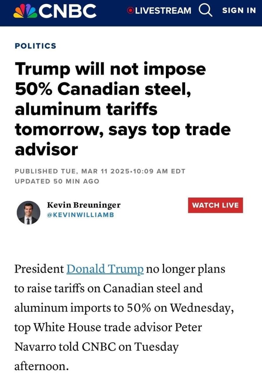 속보) 미국, 캐나다 대상 철강,알루미늄 50%관세 취소하기로 rh1 0 100 0 2025.03.12 11:45 트럼프 대통령, 수요일에 예정되어있던 캐나다 대상 철강,알루미늄 50%관세 취소할것 0