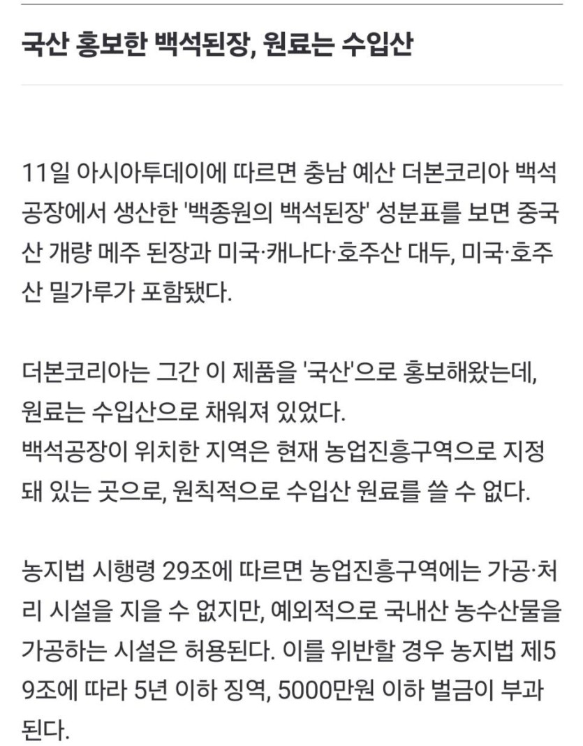 국산이라던 백종원 된장 알고보니 중국산