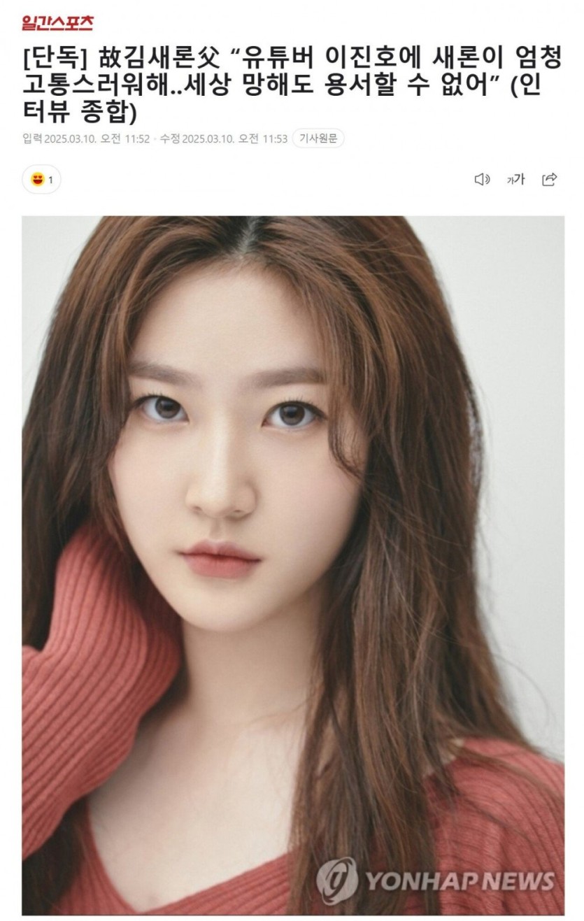 지난달 16일 배우 김새론이 스물 다섯, 젊은 나이에 세상을 떠났다. 20일이 흐른 지난 9일 고인의 아버지를 비롯한 가족들이 일간스포츠와 인터뷰를 가졌다. 고인의 가족들은 “유튜버 이진호를 비롯한 사이버렉카들과 그들의 영상을 무분별하게 받아쓴 언론 때문에 새론이가 너무 많이 고통스러워했고, 가족들도 같이 지옥을 보냈으며, 지금도 가족들의 고통이 끝나지 않고 있다”고 호소했다.