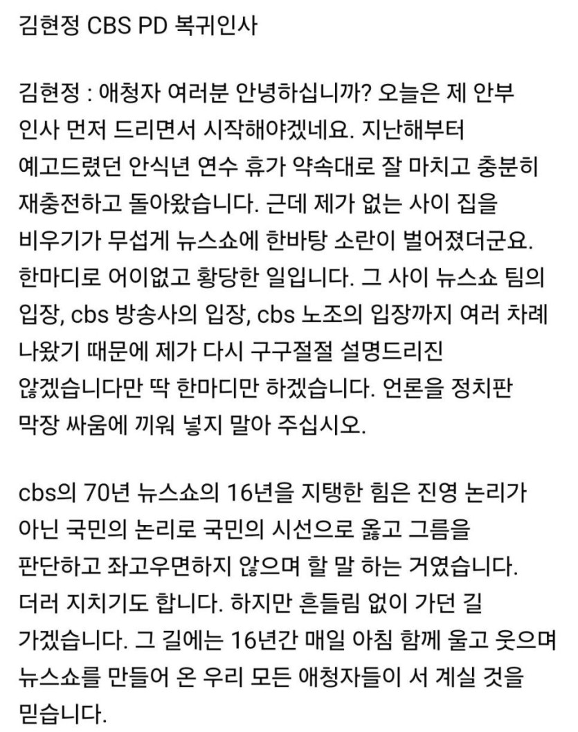 CBS김현정: 언론을 정치판 막장 싸움에 끼워넣지마십시오