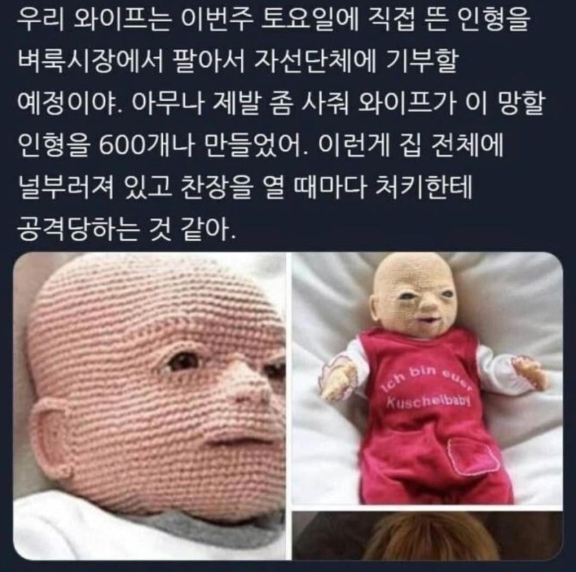 아내가 벼룩시장에서 팔려고 만든 실뜨개 인형 수준.JPG
