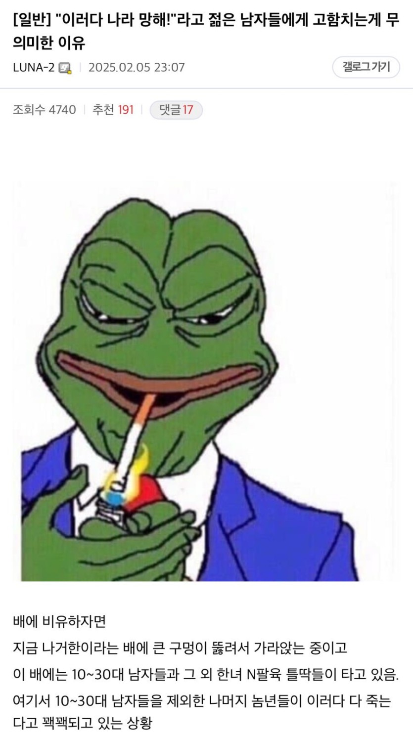 요즘 난리났다는 이대남 사고방식 ㄷㄷㄷ rh1 0 103 0 2025.03.09 16:15 아카라이브, 디씨, 인스타 등지에서 무한한 공감을 받는 중2030남자들은 사실상 ‘무국적자’가 되었음3등시민으로 사는데 그 나라를 응원할 사람은 없죠. 요즘 난리났다는 이대남 사고방식 ㄷㄷㄷ 0