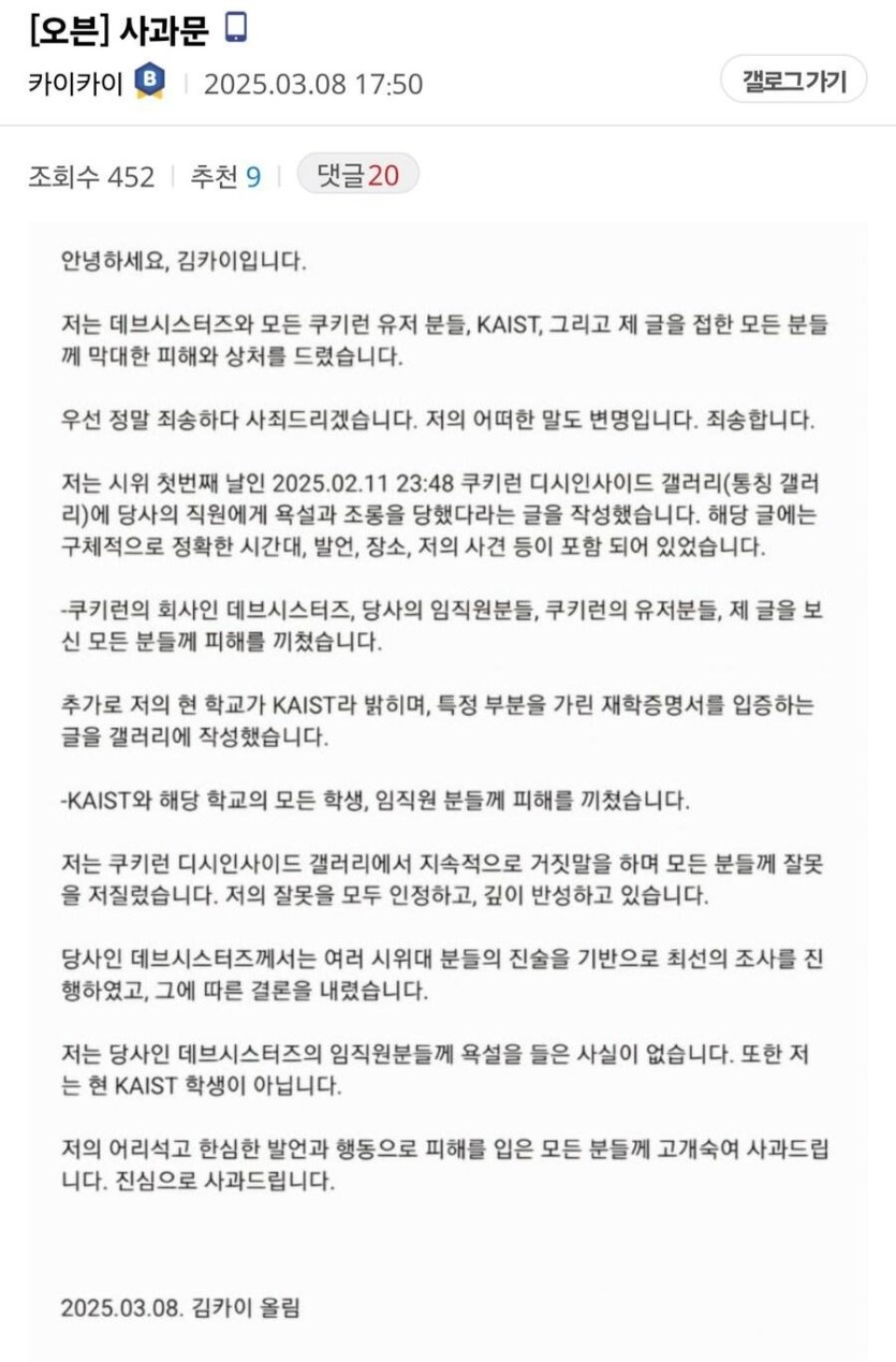 4. 자신이 카이스트라고 주장해온 쿠키런 총대 김카이는 사실 카이스트가 아니었고, 그간의 인증이 사문서위조로 이루어졌다는 사실이 검증됨. 총대는 카이스트 에타 계정을 구매해 인증에 이용해왔는데 본주가 해당 사실을 까발림.