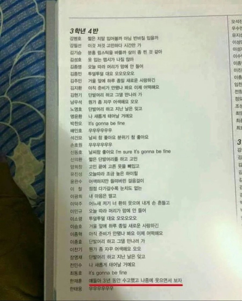 "얘들아 3년동안 수고했고"의 진실 rh1 0 171 0 2025.03.08 18:15 눈치없는 새끼의 대명사로 통하는 "얘들아 3년동안 수고했고 나중에 웃으면서 보자" 그러나 진실읃 아무도 졸업 코멘트 안 쓰고 도망가서 반장이었던 재훈이가 혼자 노래 가사로 채우고, 자기 코멘트만 썼던 것. "얘들아 3년동안 수고했고"의 진실 0