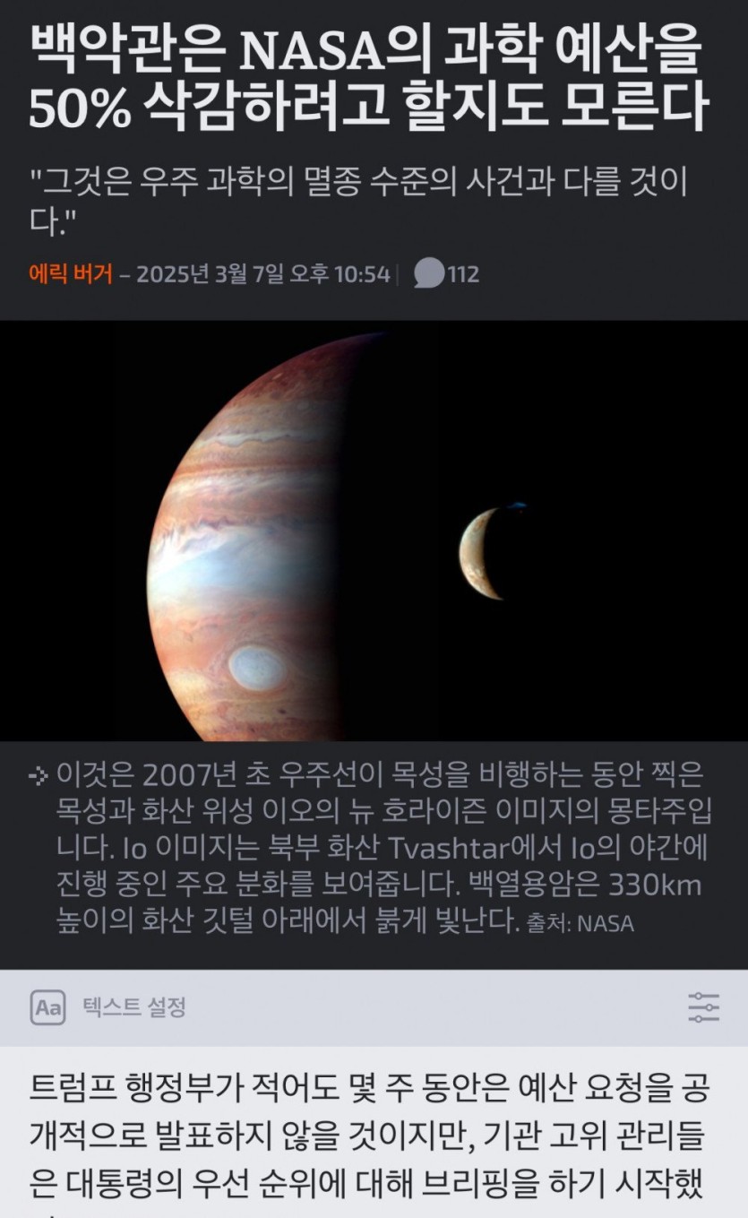 NASA 과학 예산 50% 삭감 예상 근황 rh1 0 299 0 2025.03.08 13:15 사람들이 최대 50% 삭감할꺼 같다고 함 NASA 과학 예산 50% 삭감 예상 근황 0