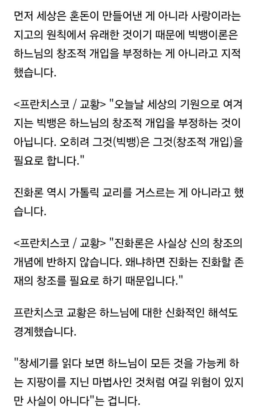 교황 "빅뱅과 진화론은 교리와 어긋나지 않아" rh1 0 222 0 2025.03.08 00:45 프란치스코 교황빅뱅과 진화론은 교리를 거스르지 않는다하느님은 절대로 위대하신 분이지만마법사같은 존재는 아니다참고로 프란치스코 교황은아르헨티나 부에노스 아이레스 대학교의대학원 과정까지 화학을 전공했다 0