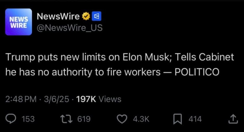 트럼프 "일론 너 공무원 해고 자격 없어" rh1 0 200 0 2025.03.08 02:00 트럼프, 일론 머스크에 대한 새로운 제한 조치 각료들에게 "머스크는 정부직원을 해고할 권한이 없다"고 전해 — POLITICO 0