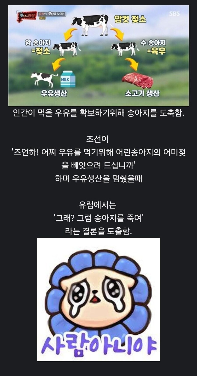 한국에 송아지 요리 카테고리가 적은 이유 rh1 0 196 0 2025.03.05 10:15 홀스타인종이라는 돌연변이가 나오기 전까지 인간이 우유를 안정적으로 얻는건 어미 소가 송아지를 출산한 이후 우유 '경쟁자'를 제거하는 것이었다. 0
