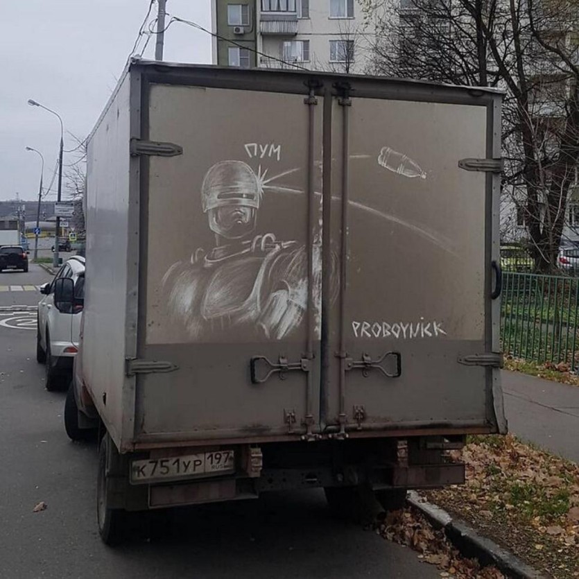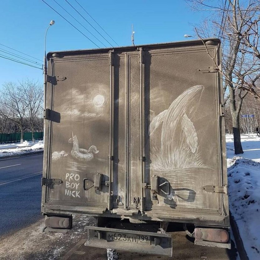먼지 쌓인 더러운 자동차에 그리는 그림