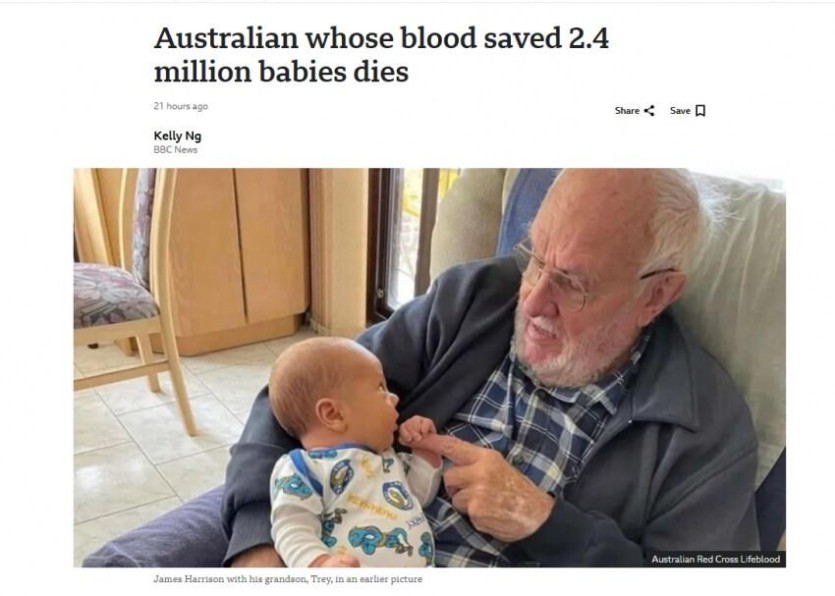 240만명의 신생아를 살린 할아버지 사망 rh1 0 407 0 2025.03.04 23:15 호주에 사시는 제임스 해리슨(88) 할아버지의 피는 희귀한 항체인 항-D가 포함되어 있었는데이는 엄마의 적혈구가 아기의 적혈구를 공격하는 HDFN를 치료하는데 사용되었다함 이를 알게된 할아버지는 18세부터 81세까지 평생을 아기들을 위해 혈장을 기증해 240만명의 아기들의 생명을 구했다고함 그리고 며칠전 요양원에서 잠을 주무시다가 편하게 사망함. 0