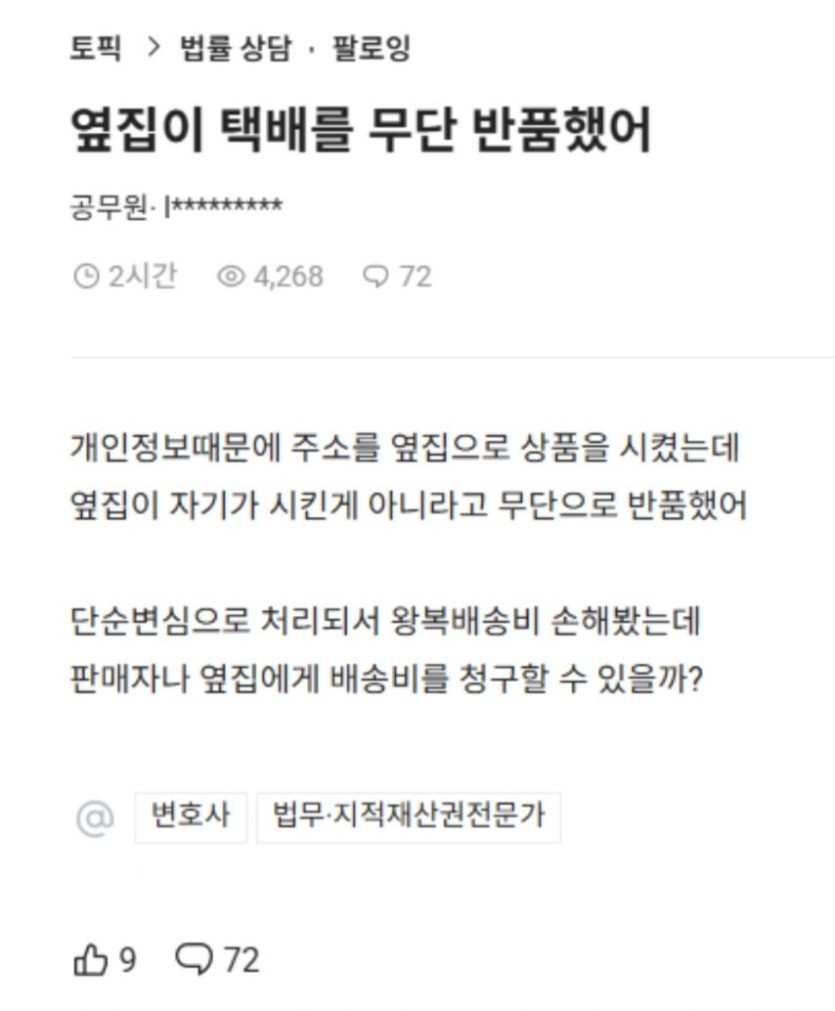 옆집이 내 택배를 무단반품 시켰어