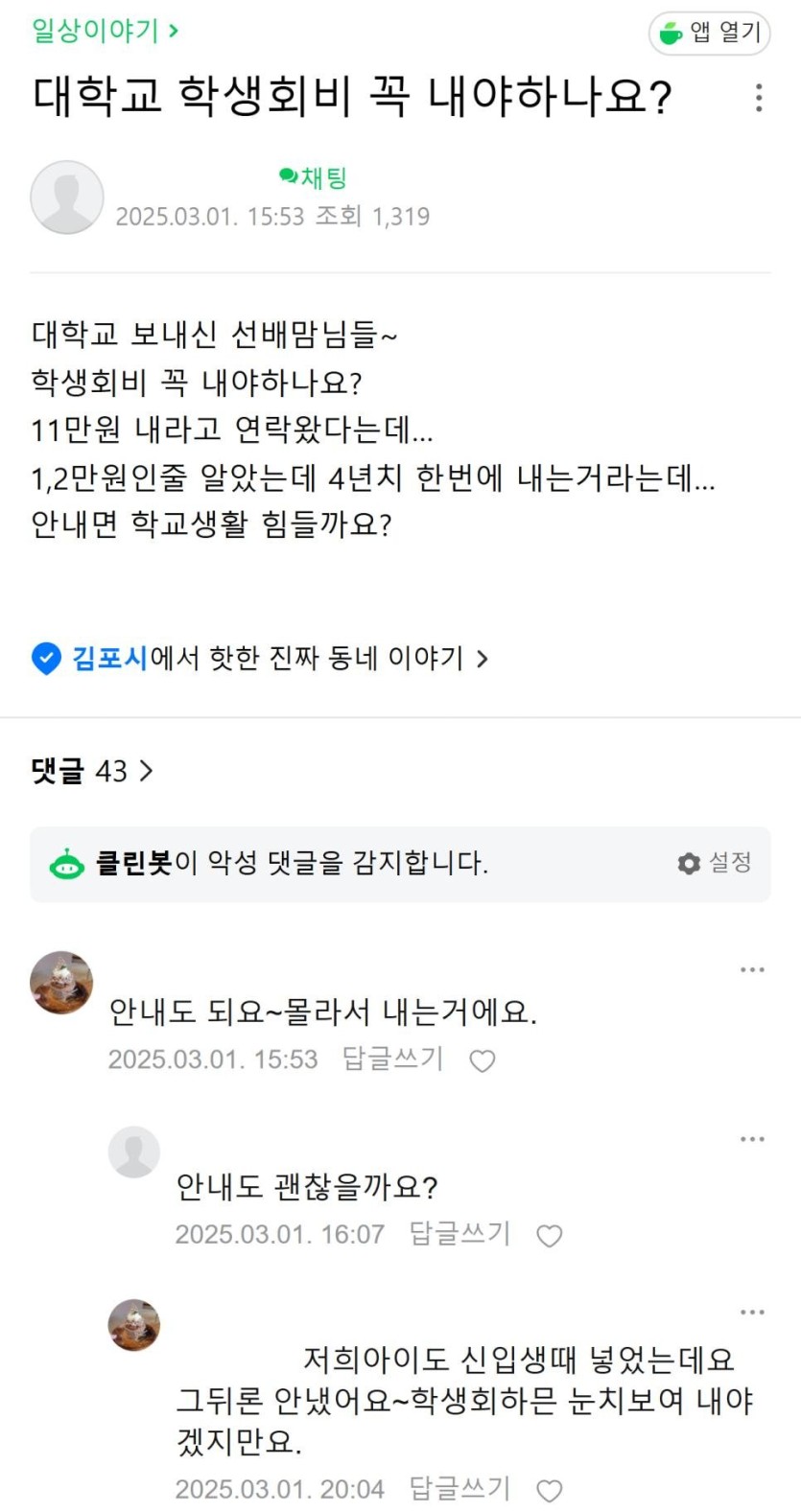 요즘 대학생들은 학생회비 얼마씩 내나요?
