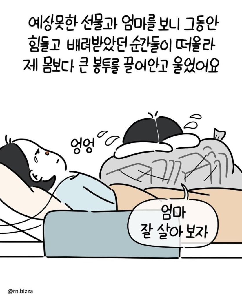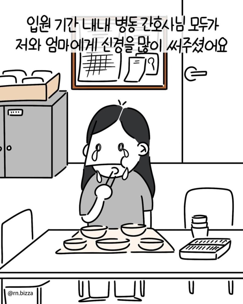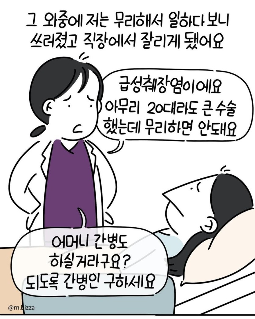 췌장염에 걸린 상태로 어머니를 간병하는 딸.Manhwa