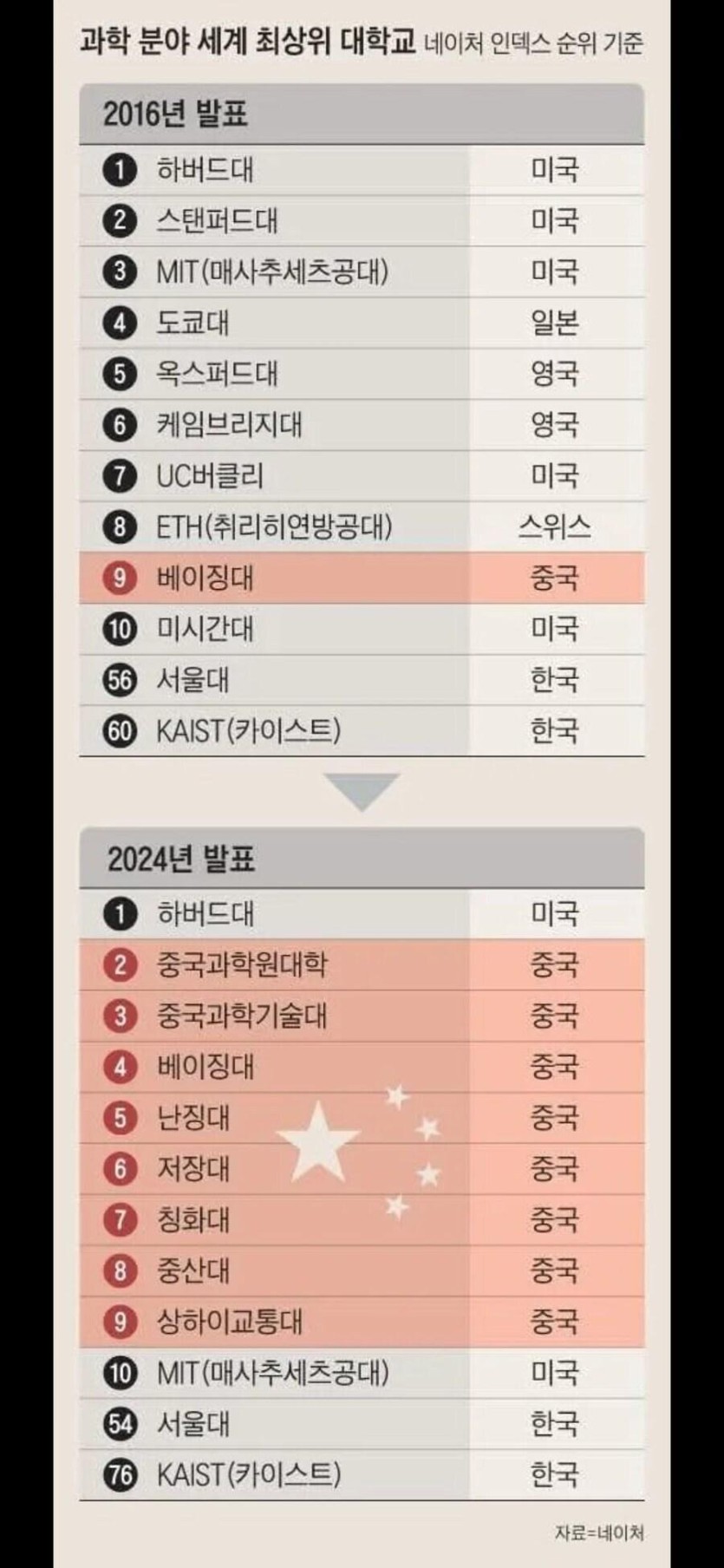 네이처 "과학 분야, 2위부터 9위는 중국 기관"