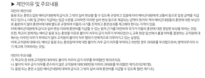 어제 국회 통과된 예비군법 개정안 근황 ㄷ.jpg rh1 0 84 0 2025.02.28 18:30 - 교통비, 실비 외에 훈련비를 별도 규정 - 교육 현장애서 출결 등과 관련해서 불이익이 있을 경우 교직원에 대해 과태료 부과 0
