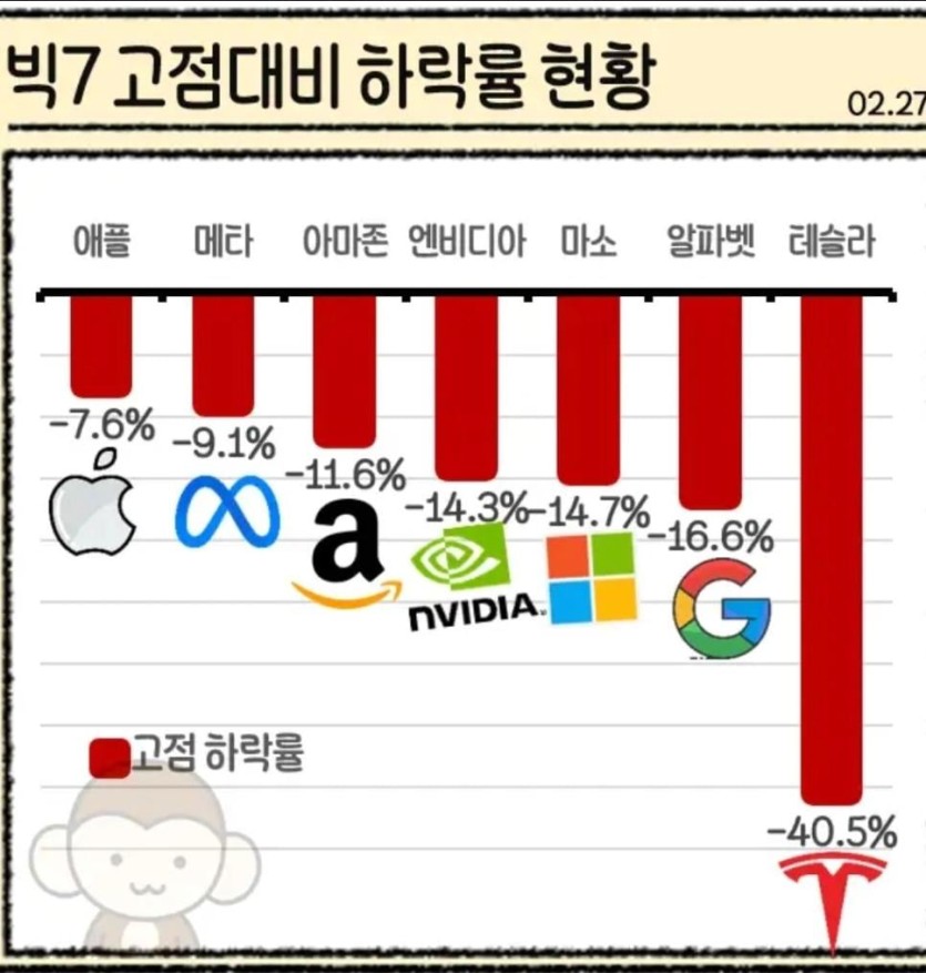 미국 빅7 주식 고점대비 하락률 현황
