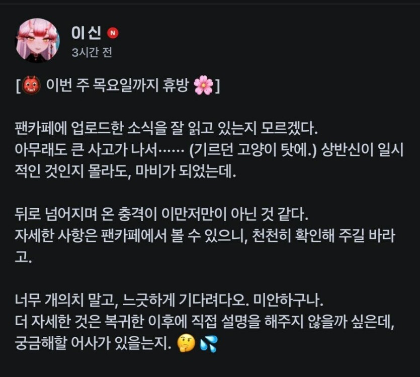 버튜버 휴방 이유 rh1 0 189 0 2025.02.25 19:15 이신이라는 노래하는 버튜버 화장실 갈려고 하는데 고양이가 갑자기 달려들어서 놀래 가지고 뒤로 넘어짐 병원에서는 마비증세 판단 받을가능성 있다함. 좀더 지켜보겠지만 0