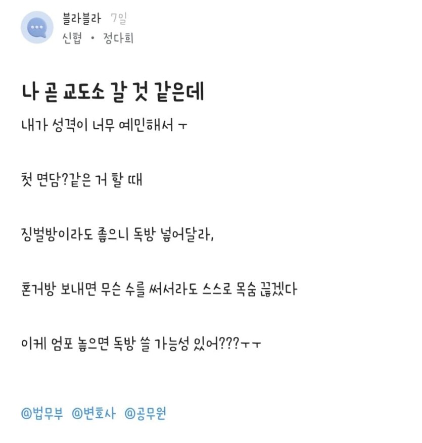교도소 온수 샤워 가능하냐고 묻는 사람.blind rh1 0 328 0 2025.02.25 12:45 왜 묻느냐 음주운전 6회 ㄷㄷㄷㄷㄷ 이 상황에도 블라인드에 독방 가능하냐 온수샤워 되냐고 묻는거 보면 멘탈 갑인듯 0