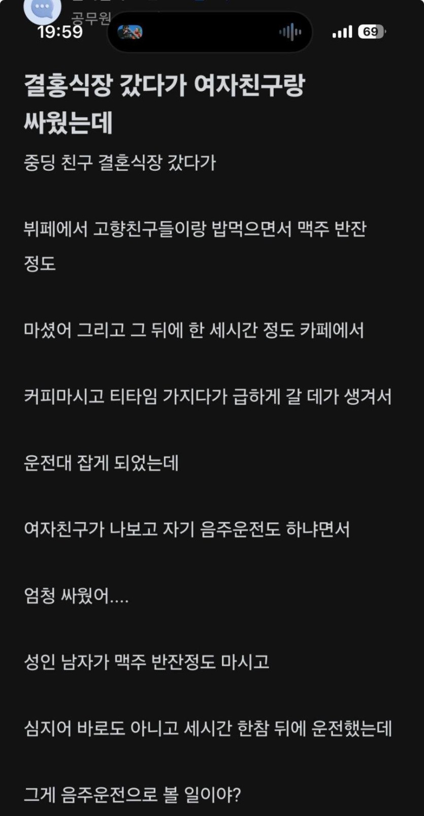 음주운전으로 여자친구랑 싸운 블라인