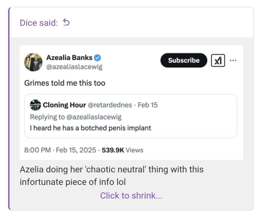 일론 머스크 고자설 급부상중 rh1 0 636 0 2025.02.25 07:15 며칠전 전여친인 그라임스가 관련해서 주변 사람들에게 퍼트리다가X에서 쉐도우밴 당했다는 설이 퍼지는중지금까지 나오는 아이들은 시험관 수정으로 나온거라고.. 0