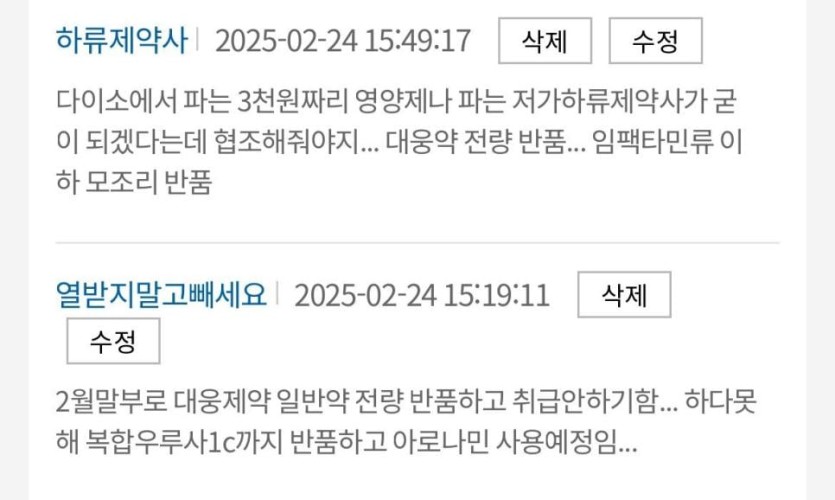 현재) 난리난 다이소 vs 약국 근황 ㄷ..jpg rh1 0 188 0 2025.02.24 23:45 https://n.news.naver.com/mnews/article/015/0005098165?sid=101https://www.kpanews.co.kr/article/show.asp?idx=257372&category=B오늘부터 다이소에 건강기능식품, 영양제 풀림가격은 약국보다 당연히 쌈난리난 약사 커뮤 반응 0