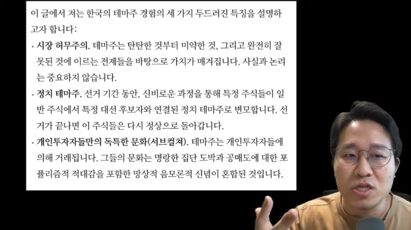 테마주 특징 3가지 : 시장 허무주의(사실관계는 중요하지 않다), 정치 테마주, 개미들의 서브컬쳐