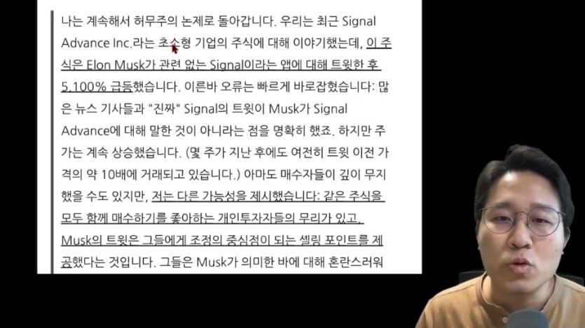 일론 머스크가 Signal이라는 앱에 대해 언급한 뒤 Signal Advance 주식이 급등한 적이 있다.