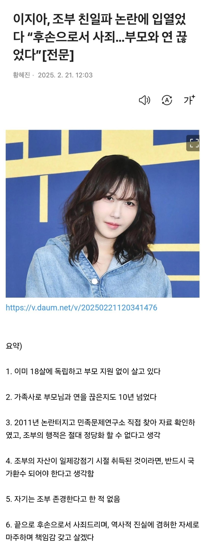 이지아, 조부 친일파 관련 입장문 발표 ㄷㄷㄷ