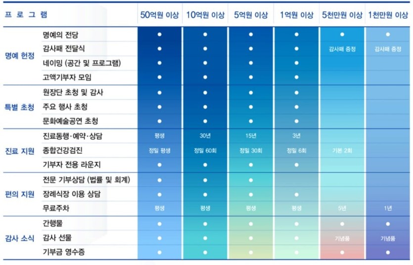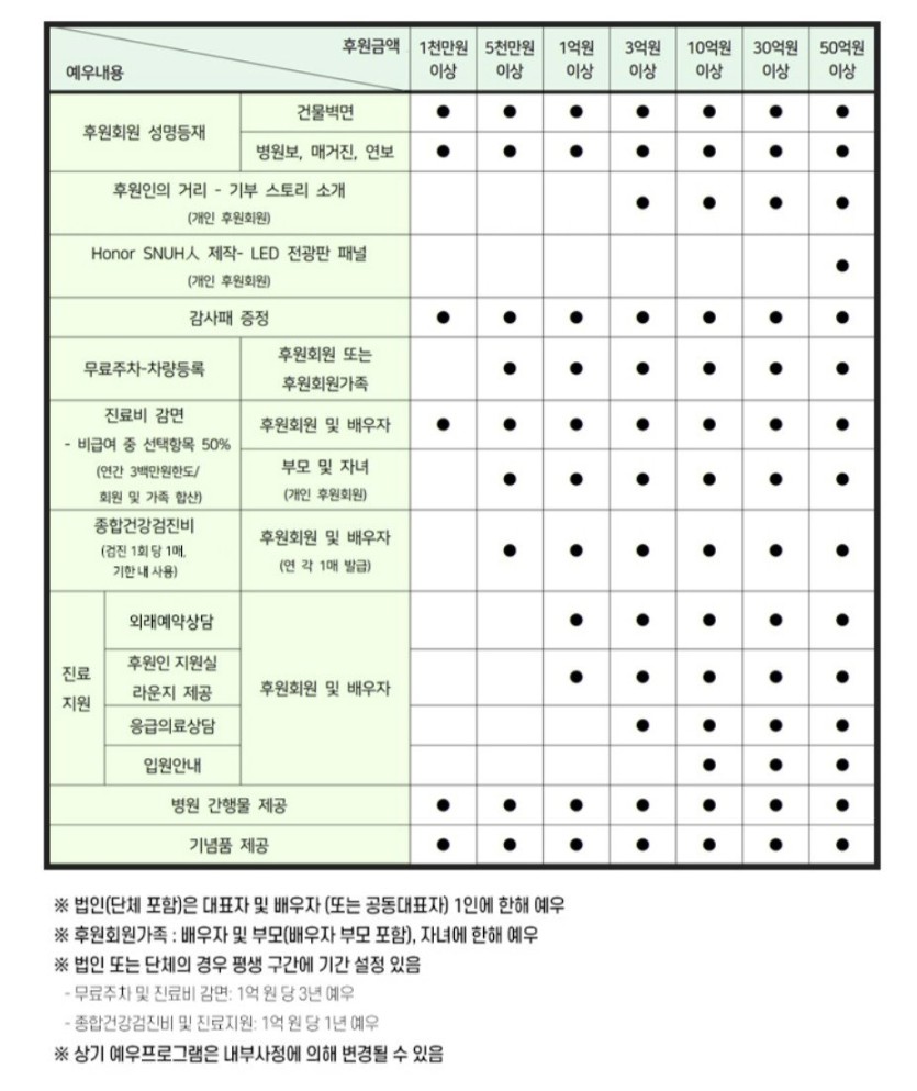 병원에 기부하면 받을 수 있는 vip 혜택 rh1 0 101 0 2025.02.19 00:00 서울 삼성 세브란스 세브란스도 1000만원 이상부터 의료 혜택인데 표에는 안나옴 서울대 0