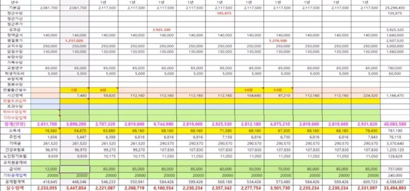고등학교 교사 1년차 & 10년차 실수령액 rh1 0 149 0 2025.02.18 15:15 1년차 아니면 2년차 1년에 2번 명절상여금 각 120만원 정도 1년에 1번 성과금 300~400만원 정도 정근수당은 1년에 2번 나오는 수당 일년 총 실수령액에 나누기 12하면 평균 월 실수령액 2,791,241원 한 280만원 10년차 월 평균 실수령액 4,001,385원 딱 400만원 0