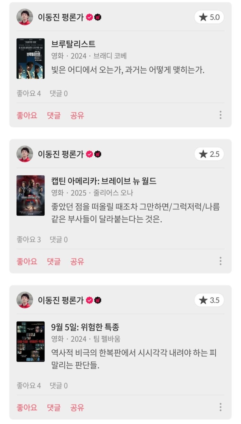 이동진 평론가 신작 영화들 평점(올해 첫 만점 나옴)