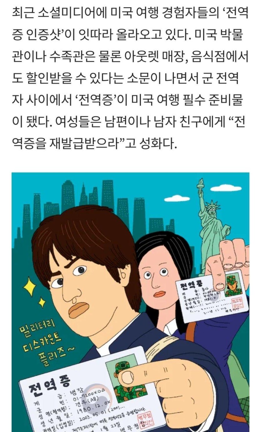 최근 전역증 재발급이 급증한 이유 rh1 0 81 0 2025.02.17 13:15 미국에서는 전역 군인들한테 할인해주는 가게가 많음.아웃렛, 식당, 호텔, 백화점 등등 최대 20% 까지미국은 특히 과거 전쟁에서는 한국을 혈맹으로 인식하기 때문에 한국 군인도 인정해 준다고미국은 모병제라 더 챙기는 감이 있지만 한국이 전역 후에 뭔가가 적은건 사실이다자국보다 미국가서 더 대우받는다는게 웃기긴 하네 0