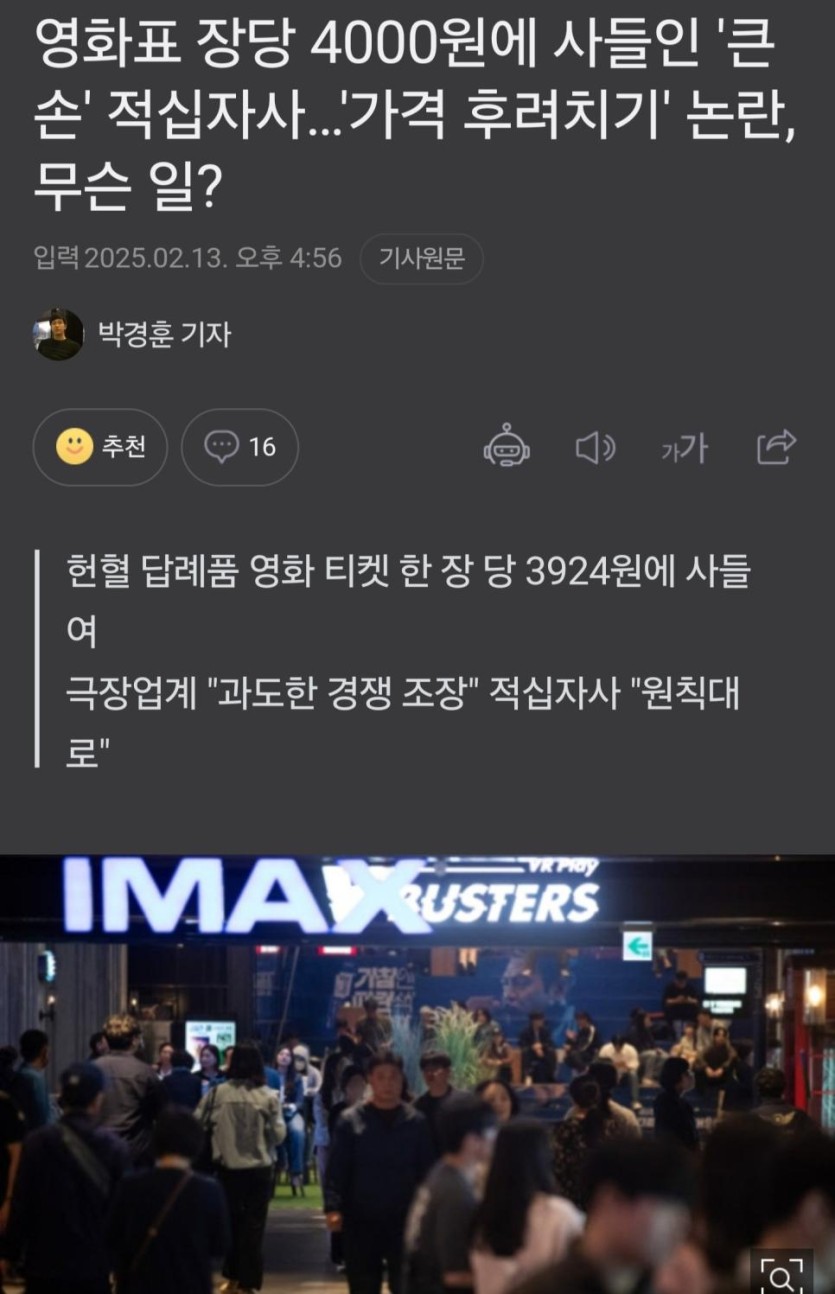 헌혈 보상... 영화티켓 4,000원 ㄷㄷ.jpg rh1 0 201 0 2025.02.16 08:45 https://n.news.naver.com/article/011/0004450232?ntype=RANKING 0