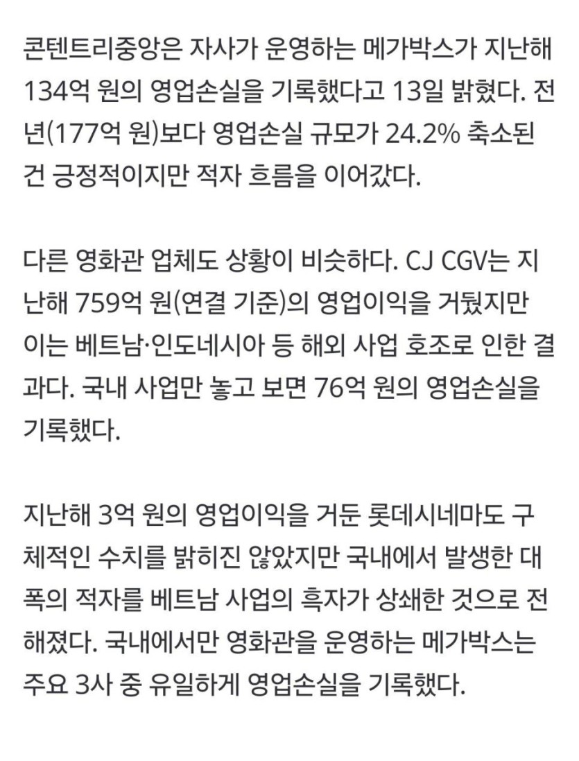 영화관 업계...빅3 올해 국내사업 모두 적자
