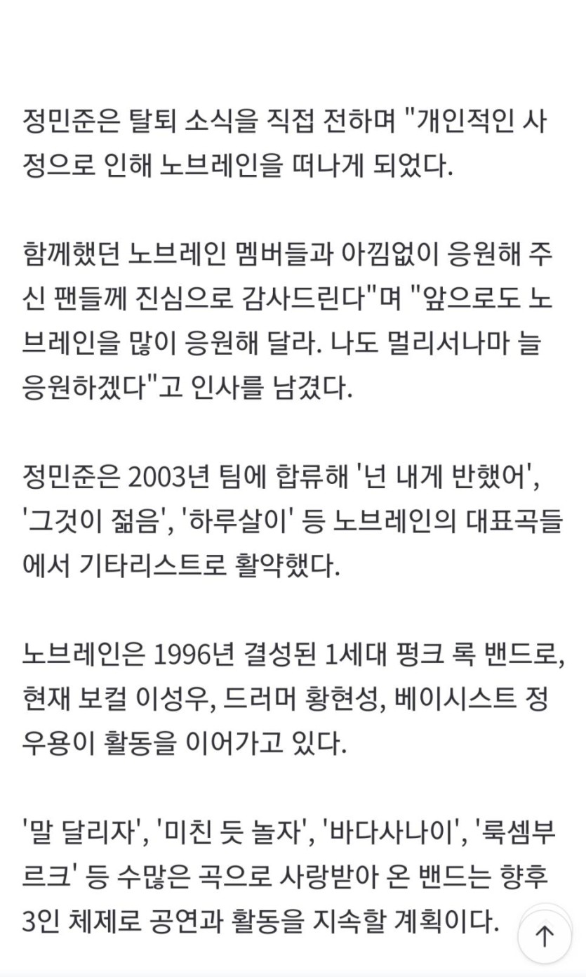 노브레인, 3인 체제로 재편… 정민준 "멀리서 응원하겠다" rh1 1 155 0 2025.02.15 15:15 '말 달리자', '미친 듯 놀자', '바다사나이', '룩셈부르크' 등 수많은 곡으로 사랑받아 온 밴드........는 크라잉넛이잖아 기자놈아 ㅋㅋㅋ 0
