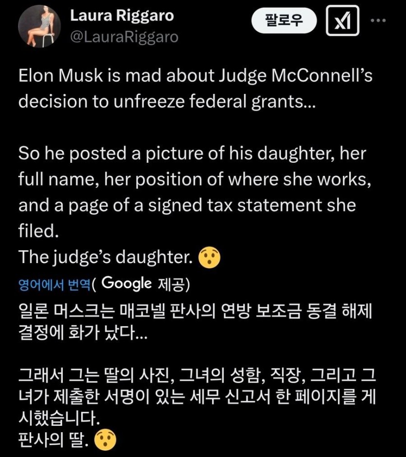 머스크 행정명령 제동건 판사 딸 신상 공개 rh1 0 127 0 2025.02.15 10:30 일론 머스크가 연방 정부 지원금 다시 풀어라 판결 낸 판사 본인도 아니고 판사 “딸”을 좌표찍어서 공격함...테슬람 MAGA족들은 이미 다 공개된 내용인데 뭐가 문제냐고 주장중 0